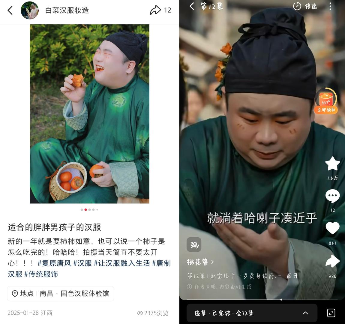 “已经不能说是像了,剧中人简直跟我一模一样。”白先生告诉红星新闻,剧中使用的绿色汉服妆造人物形象,实际是自己2025年春节后不久拍摄的个人写真,“衣服帽子是我自己买的,妆造是我自己设计的,照片是我家人给我拍的。”