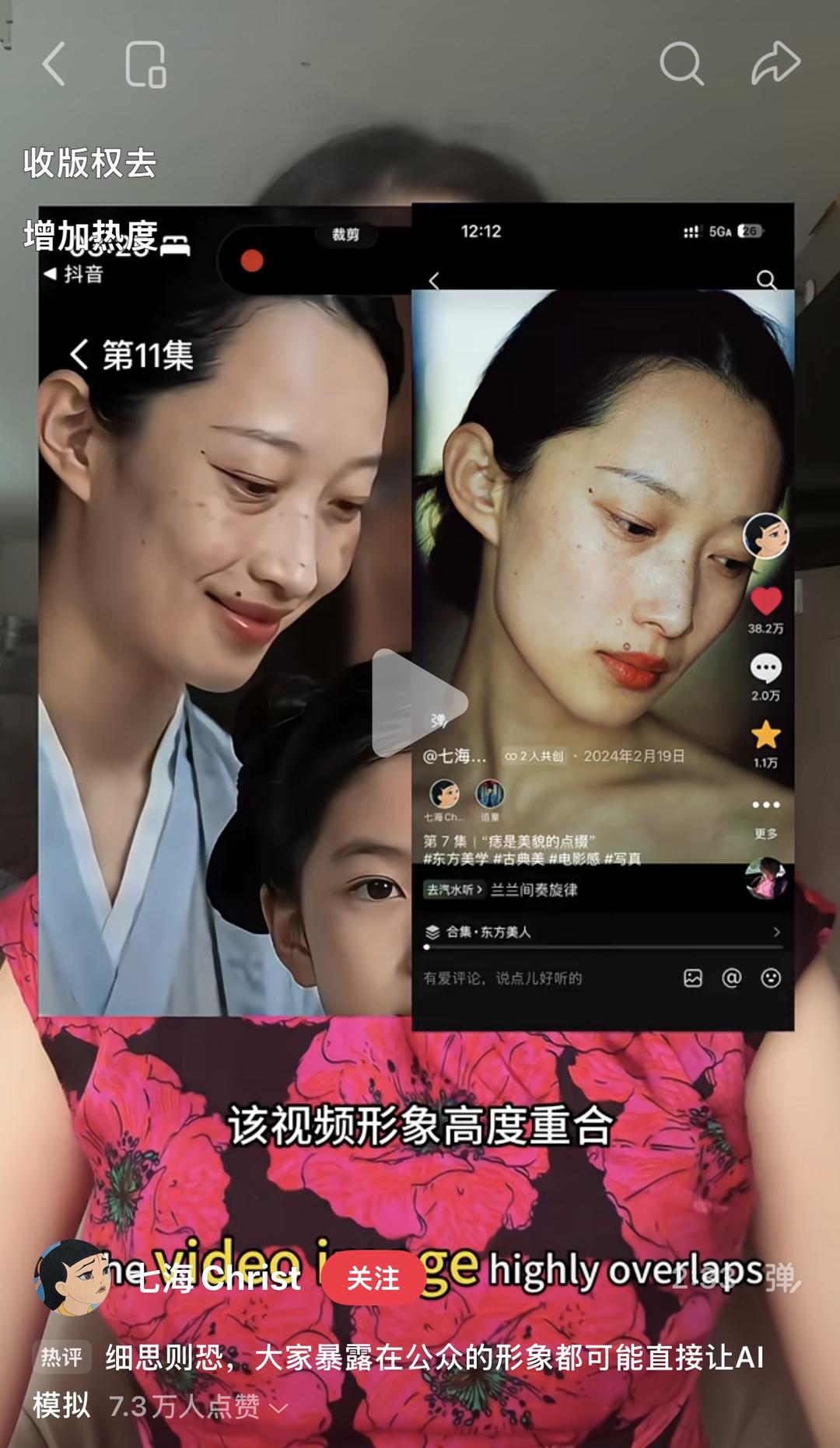 被短剧“偷脸”并非白先生一人的遭遇。红星新闻记者注意到,博主“七海Christ”也在3月31日公开发帖称,其面部形象被《桃花簪》盗用,且剧中角色带有侮辱丑化色彩。“七海”在视频中表示,自己作为商业模特,个人脸部形象是其核心职业资产和商业价值的载体,该短剧在未获授权情况下擅自盗用创作对个人造成极大影响。
